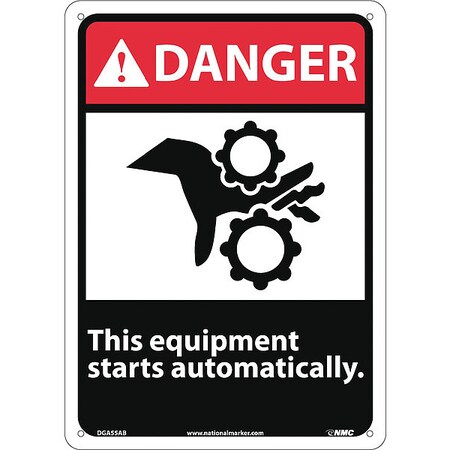 NMC DGA55AB ANSI Sign, Legend "DANGER - This Equipment Starts Automatically." with Graphic, 10" Length x 14" Height, Aluminum, Black/Red on White