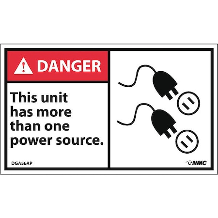 NMC DGA56AP 3"x 5"ANSI Sign w/Legend:Danger - This Units Has More Than One Power Source, 25 Packs of 5 pcs