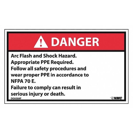 NMC DGA58AP 3"x 5"ANSI Sign w/Legend:Danger - Arc Flash And Shock Hazard Appropriate Ppe Required Follow All Safety, 25 Packs of 5 pcs