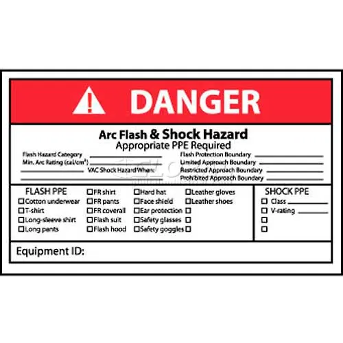 | Feature | Header "DANGER" and legend "Arc Flash & Shock Hazard Appropriate PPE Required" |