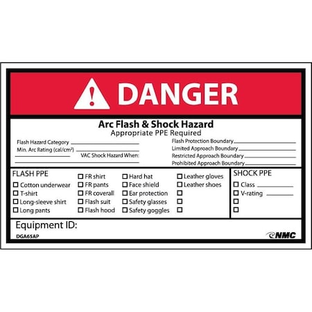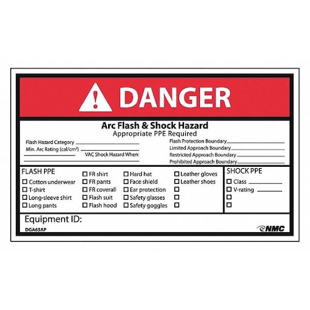 NMC DGA65AP 3"x 5"ANSI Sign w/Legend:Danger - Arc Flash & Shock Hazard, 25 Packs of 5 pcs