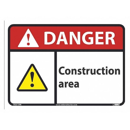 NMC DGA73PB Danger - Construction Area Sign - 14 in. x 10 in. PS Vinyl Danger Signage with Safety Alert Symbol, Black/White Text on White/Red Base