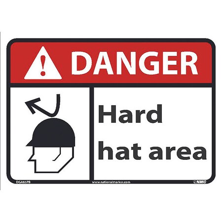 NMC DGA85PB Danger - Hard Hat Area Sign - 14 in. x 10 in. Adhesive Backed Vinyl Danger Sign with Graphic, Black/White Text on White/Red Base