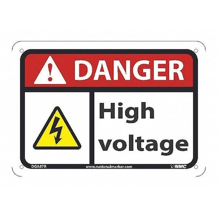 NMC DGA87R Danger High Voltage Sign - 10 in. x 7 in. Rigid Plastic Danger Sign with Graphic, Black/White Text on White/Red Base