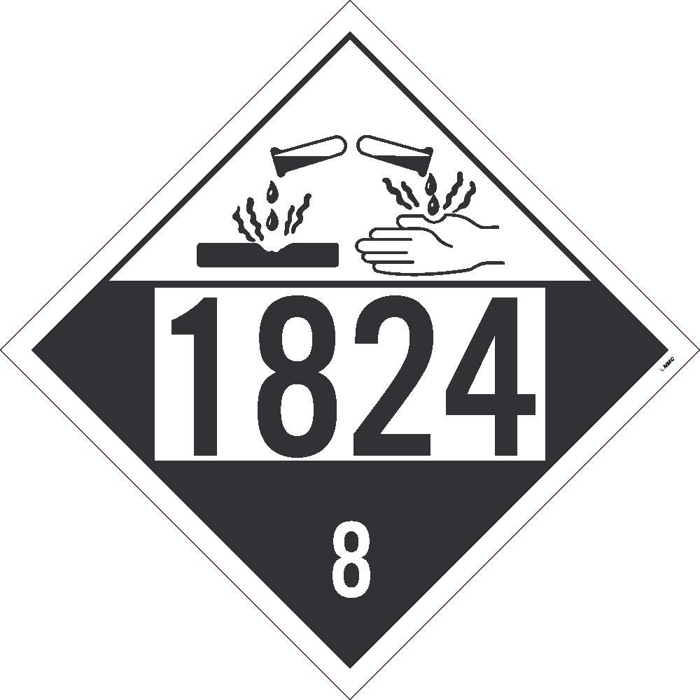 DL147BUV100, DOT Placard Sign, Sodium Hydroxide, 1824 8, 10 X 10 , PVC, Flexible PVC, .015 Unrippable Vinyl, Pack 100 Corrosive materials can cause serious bodily harm. Prevent a terrible accident by distinctly marking such materials with our 1824 8 DOT Placard sign.