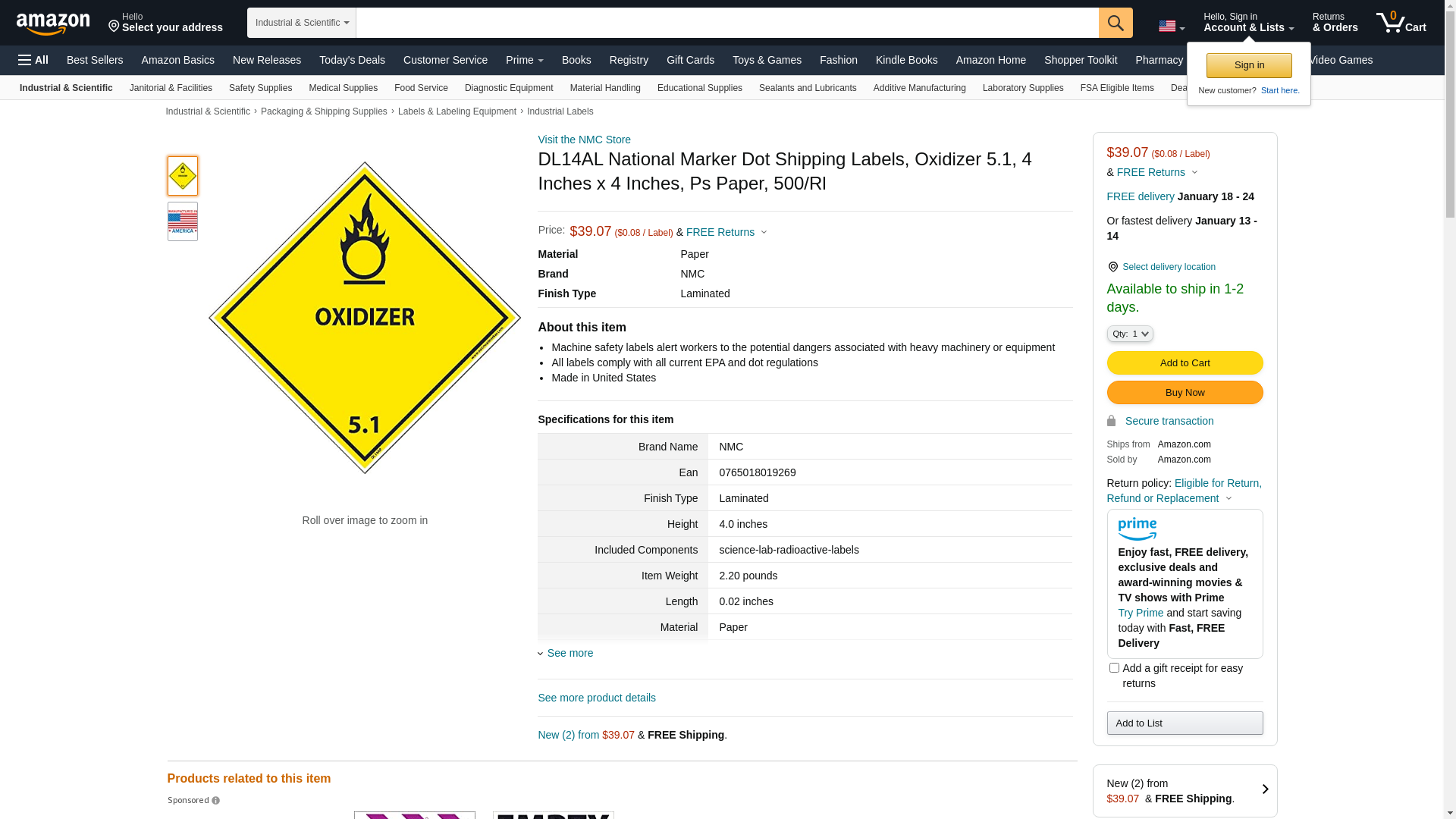 NMC DL14AL National Marker Dot Shipping Labels, Oxidizer 5.1, 4 Inches x 4 Inches, Ps Paper, 500/Rl