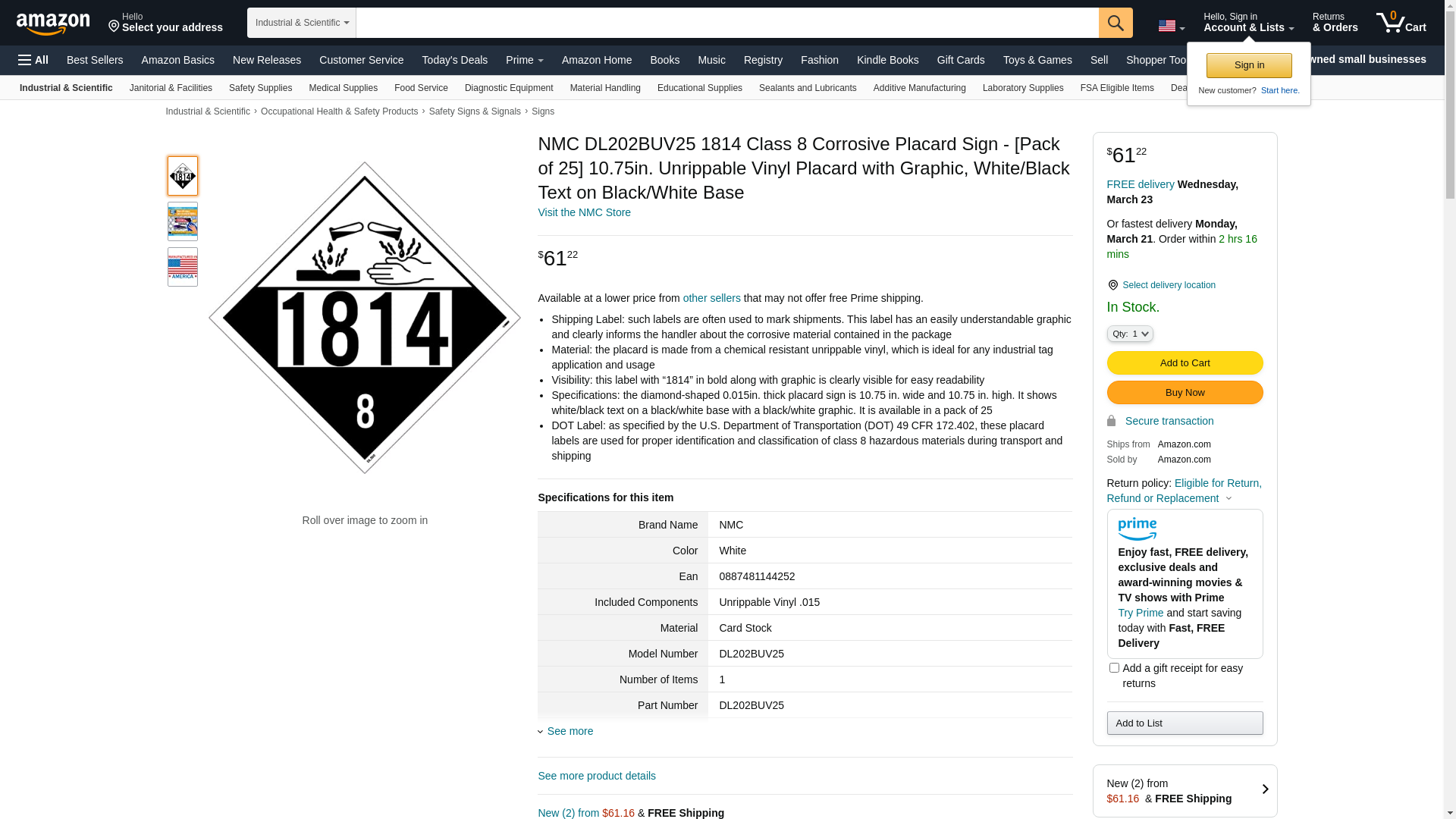 NMC DL202BUV25 1814 Class 8 Corrosive Placard Sign - [Pack of 25] 10.75in. Unrippable Vinyl Placard with Graphic, White/Black Text on Black/White Base