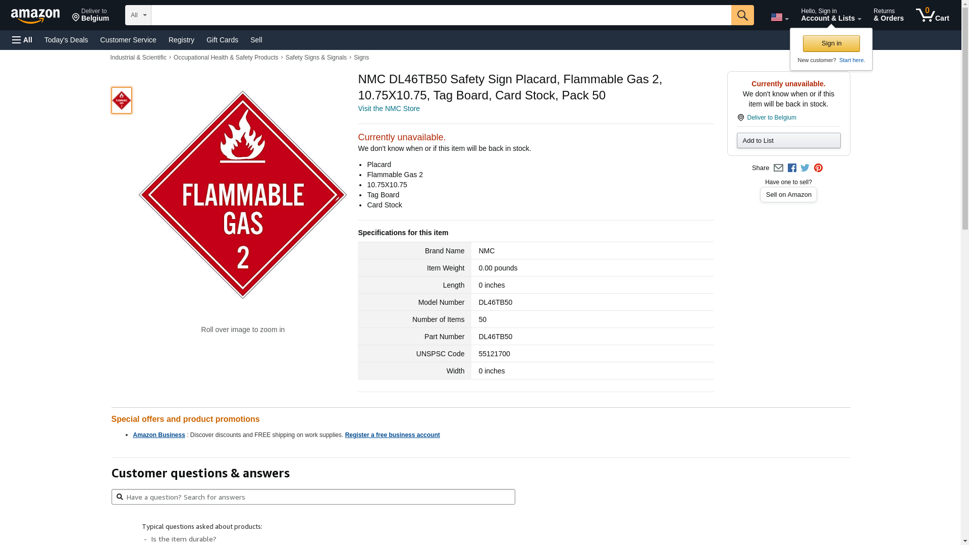 NMC DL46TB50 Safety Sign Placard, Flammable Gas 2, 10.75X10.75, Tag Board, Card Stock, Pack 50