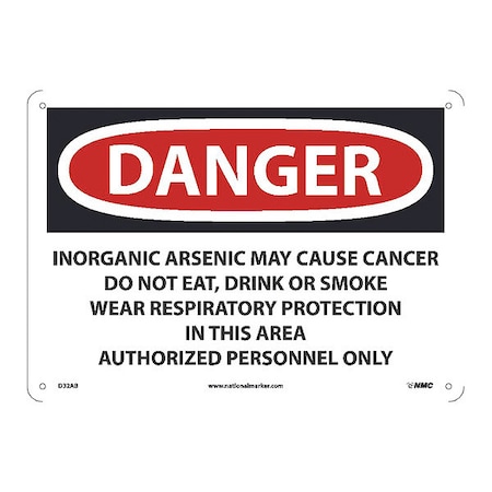 OSHA Sign D32. Legend: Danger Inorganic Arsenic May Cause Cancer Do Not Eat, Drink Or Smoke Wear Respiratory Protection In This Area Authorized Personnel Only