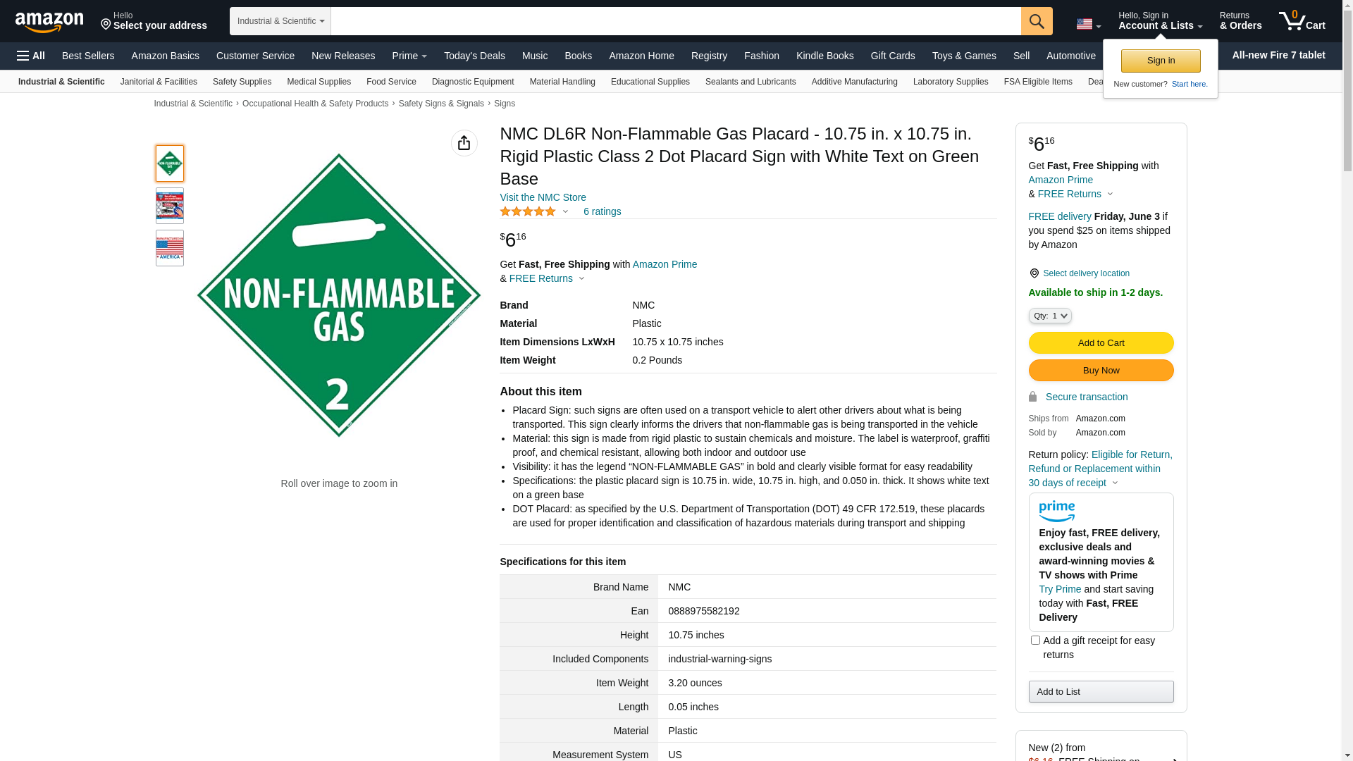 NMC DL6R NON-FLAMMABLE GAS Placard - 10.75 in. x 10.75 in. Rigid Plastic Class 2 Dot Placard Sign with White Text on Green Base