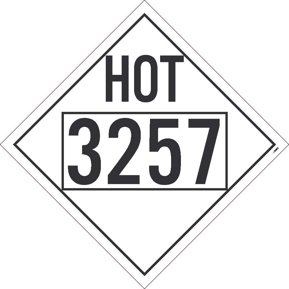 DL85BPR100, DOT Placard Sign, Hot, 3257, Four Digit , 10 x 10 , Removable PS Vinyl, Pack 100 It is your duty to keep others safe and informed around hazardous materials. Achieve this by using our HOT 3257 Misc DOT Placard sign to notify those in the area that the contents being carried are hot.