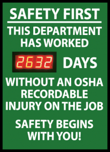 - Visibility: the scoreboard with “SAFETY FIRST - THIS DEPARTMENT HAS WORKED ___ DAYS WITHOUT AN OSHA RECORDABLE INJURY - ON THE JOB SAFETY BEGINS WITH YOU! has indoor viewing distance of 120 ft. It ensures easy readability in poor lighting