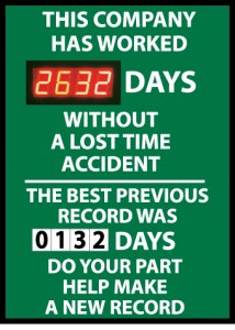 - Visibility: the scoreboard with “THIS COMPANY HAS WORKED ____ DAYS WITHOUT A LOST TIME ACCIDENT OUR BEST PREVIOUS RECORD WAS _____ DAYS- DO YOUR PART HELP MAKE A NEW RECORD! ensures easy readability with viewing distance of 120 ft.