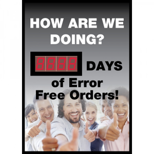 - Visibility: the safety scoreboard with “HOW ARE WE DOING __ DAYS of Error Free Orders!” has indoor viewing distance of 120 ft. The white and Black text on the graphic ensures easy readability in poor lighting