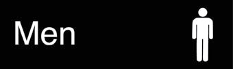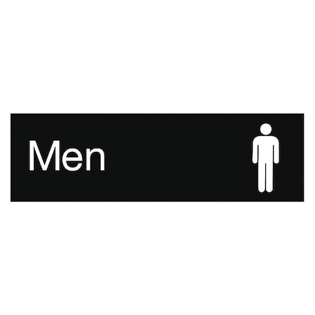 - Specification: the rectangular plastic sign is 10 in. wide and 3 in. high. It shows white text and men graphic on a black base
