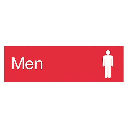 - Specification: the rectangular plastic sign is 10 in. wide and 3 in. high. It shows white text and men graphic on a red base