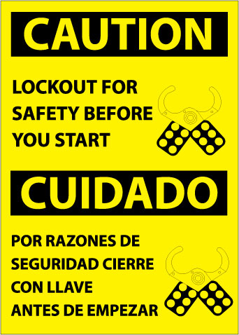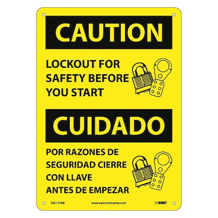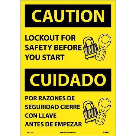 NMC ESC177RB Bilingual OSHA Sign, Legend "CAUTION - LOCKOUT FOR SAFETY BEFORE YOU START", 10" Length x 14" Height, Rigid Plastic, Black on Yellow