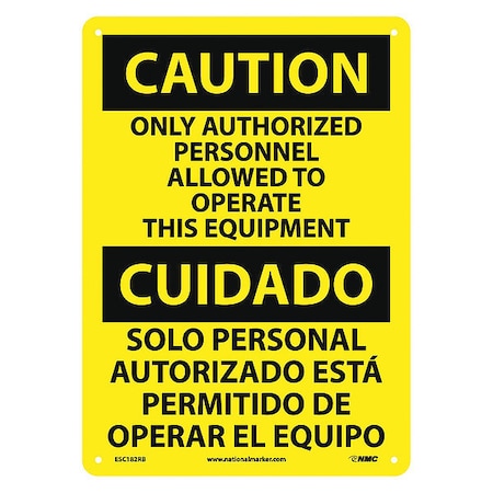 NMC ESC182RB Bilingual OSHA Sign, Legend "CAUTION - ONLY AUTHORIZED PERSONNEL ALLOWED TO OPERATE THIS EQUIPMENT", 10" Length x 14" Height, Rigid Plastic, Black on Yellow