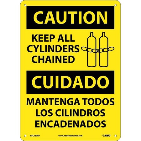 NMC ESC530AB Bilingual OSHA Sign, Legend "CAUTION - KEEP ALL CYLINDERS CHAINED" with Graphic, 10" Length x 14" Height, 0.040 Aluminum, Black On Yellow