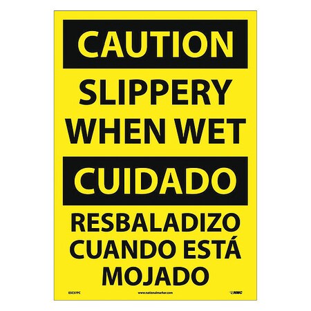 NMC ESC57PC Bilingual OSHA Sign, Legend "CAUTION - SLIPPERY WHEN WET", 14" Length x 20" Height, Pressure Sensitive Vinyl, Black On Yellow