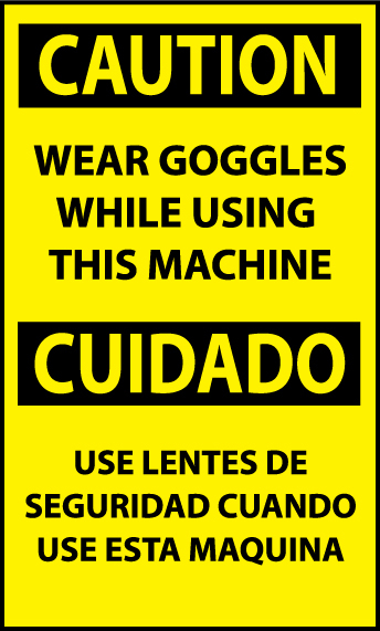 NMC - National Marker Company CAUTION, WEAR GOGGLES WHILE USING THIS MACHINE BILINGUAL, 5X3, PS VINYL OSHA Signs OSHA signs are the perfect way to alert your employees and guests when a hazard is present in your facility. Keep your facility safe, buy an OSHA regulated sign today and prevent an accident tomorrow. These OSHA signs comply with OSHA 29 CFR 1910.145