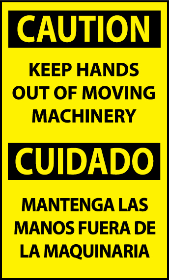 NMC - National Marker Company CAUTION, KEEP HANDS OUT OF MOVING MACHINERY BILINGUAL, 5X3, PS VINYL OSHA Signs OSHA signs are the perfect way to alert your employees and guests when a hazard is present in your facility. Keep your facility safe, buy an OSHA regulated sign today and prevent an accident tomorrow. These OSHA signs comply with OSHA 29 CFR 1910.145