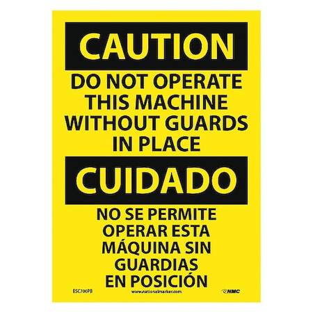 NMC ESC700PB Bilingual OSHA Sign, Legend "CAUTION - DO NOT OPERATE THIS MACHINE WITHOUT GUARDS IN PLACE", 10" Length x 14" Height, Pressure Sensitive Vinyl, Black On Yellow