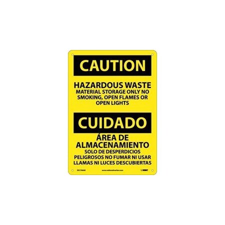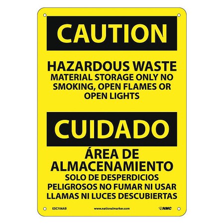 NMC ESC706AB Bilingual OSHA Sign, Legend "CAUTION - HAZARDOUS WASTE MATERIAL STORAGE ONLY NO SMOKING, OPEN FLAMES OR OPEN LIGHTS", 10" Length x 14" Height, 0.040 Aluminum, Black On Yellow