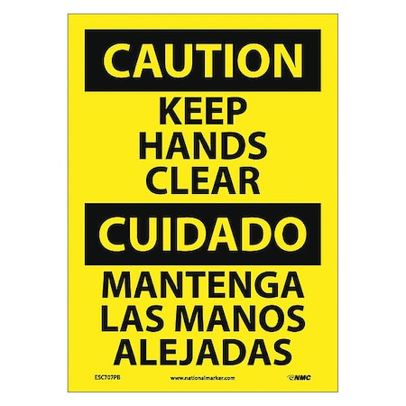 NMC ESC707PB Bilingual OSHA Sign, Legend "CAUTION - KEEP HANDS CLEAR", 10" Length x 14" Height, Pressure Sensitive Vinyl, Black On Yellow