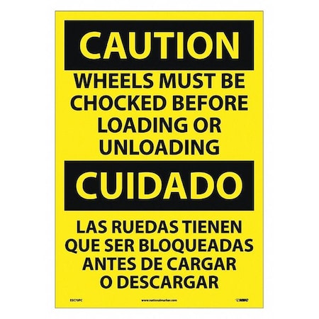NMC ESC70PC Bilingual OSHA Sign, Legend "CAUTION - WHEELS MUST BE CHOCKED BEFORE LOADING OR UNLOADING", 14" Length x 20" Height, Pressure Sensitive Vinyl, Black On Yellow