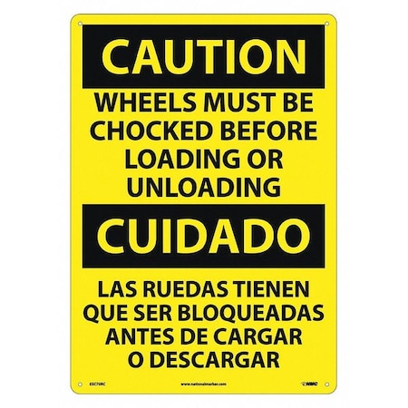 NMC ESC70RC Bilingual OSHA Sign, Legend "CAUTION - WHEELS MUST BE CHOCKED BEFORE LOADING OR UNLOADING", 14" Length x 20" Height, Rigid Plastic, Black On Yellow