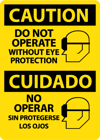 NMC ESC711PB Bilingual OSHA Sign, Legend "CAUTION - DO NOT OPERATE WITHOUT EYE PROTECTION" with Graphic, 10" Length x 14" Height, Pressure Sensitive Vinyl, Black On Yellow