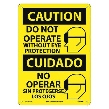 NMC ESC711RB Bilingual OSHA Sign, Legend "CAUTION - DO NOT OPERATE WITHOUT EYE PROTECTION" with Graphic, 10" Length x 14" Height, Rigid Plastic, Black On Yellow