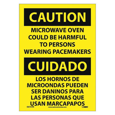 NMC ESC721PB Bilingual OSHA Sign, Legend "CAUTION - MICROWAVE OVEN COULD BE HARMFUL TO PERSONS WEARING PACEMAKERS", 10" Length x 14" Height, Pressure Sensitive Vinyl, Black On Yellow