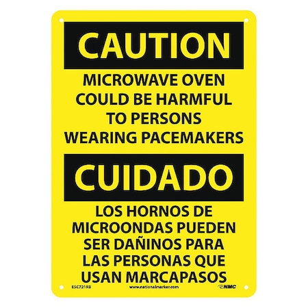 NMC ESC721RB Bilingual OSHA Sign, Legend "CAUTION - MICROWAVE OVEN COULD BE HARMFUL TO PERSONS WEARING PACEMAKRES", 10" Length x 14" Height, Rigid Plastic, Black On Yellow