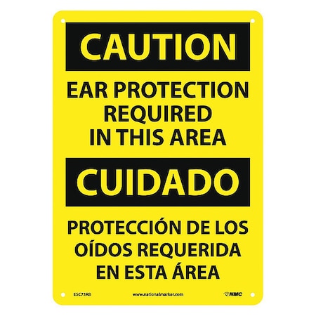 NMC ESC73RB Bilingual OSHA Sign, Legend "CAUTION - EAR PROTECTION REQUIRED IN THIS AREA", 10" Length x 14" Height, Rigid Plastic, Black On Yellow