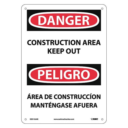 NMC ESD132AB Bilingual OSHA Sign, Legend "DANGER - CONSTRUCTION AREA KEEP OUT", 10" Length x 14" Height, 0.040 Aluminum, Black/Red on White