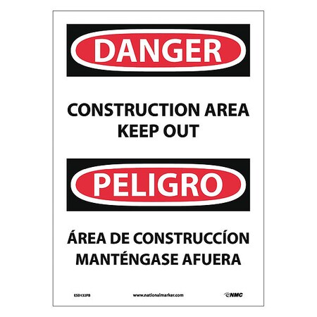 NMC ESD132PB Bilingual OSHA Sign, Legend "DANGER - CONSTRUCTION AREA KEEP OUT", 10" Length x 14" Height, Pressure Sensitive Vinyl, Black/Red on White