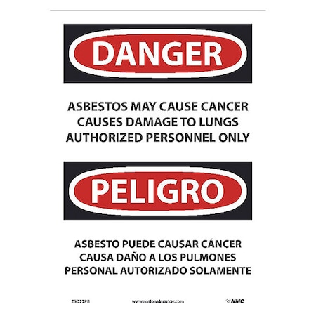 ESD22PB National Marker PELIGRO Asbestos Sign - May Cause Cancer Causes Damage to Lungs Authorized Personnel Only, 10 Inches x 14 Inches, Ps Vinyl