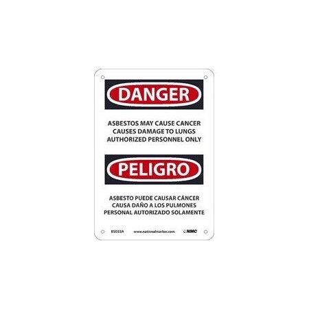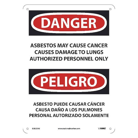 NMC ESD22RB National Marker PELIGRO Asbestos Sign - May Cause Cancer Causes Damage to Lungs Authorized Personnel Only, 10 Inches x 14 Inches, Rigid Plastic
