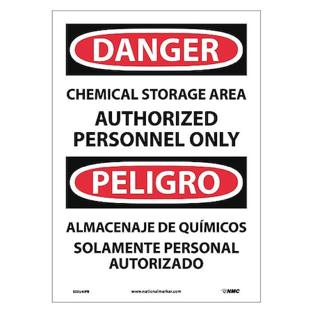 NMC ESD240PB Bilingual OSHA Sign, Legend "DANGER - CHEMICAL STORAGE AREA AUTHORIZED PERSONNEL ONLY", 10" Length x 14" Height, Pressure Sensitive Vinyl, Black/Red on White