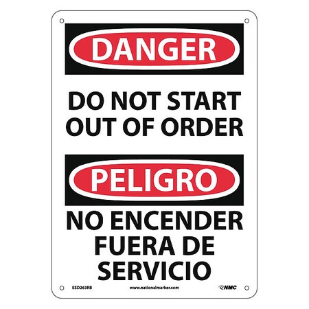 NMC ESD263RB Bilingual OSHA Sign, Legend "DANGER - DO NOT START OUT OF ORDER", 10" Length x 14" Height, Rigid Plastic, Black/Red on White