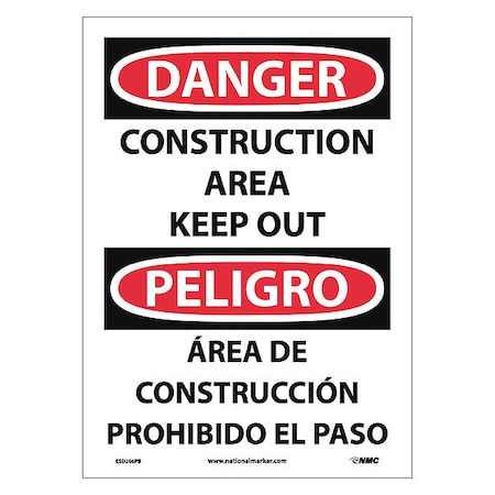 NMC ESD266PB Bilingual OSHA Sign, Legend "DANGER - CONSTRUCTION AREA KEEP OUT", 10" Length x 14" Height, Pressure Sensitive Vinyl, Black/Red on White