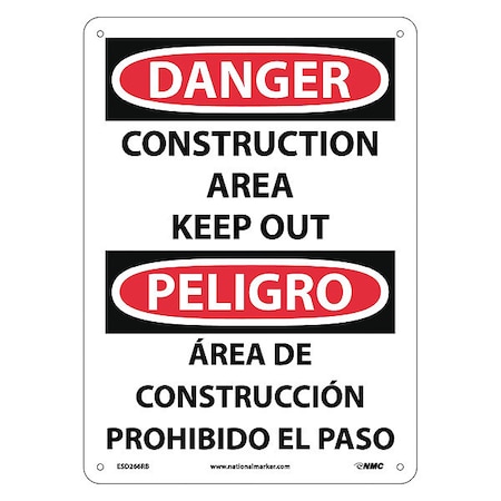 NMC ESD266RB Bilingual OSHA Sign, Legend "DANGER - CONSTRUCTION AREA KEEP OUT", 10" Length x 14" Height, Rigid Plastic, Black/Red on White