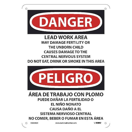 OSHA Sign ESD26. Legend: Danger Peligro Lead Work Area May Damage Fertility Or The Unborn Child Causes Damage To The Central Nervous System Do Not Eat, Drink Or Smoke In This Area (bilingual)