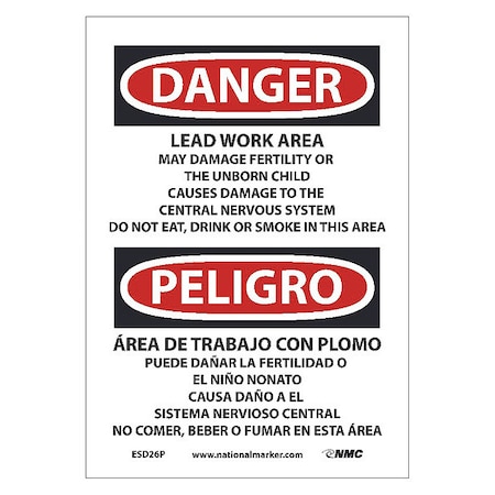 OSHA Sign ESD26. Legend: Danger Peligro Lead Work Area May Damage Fertility Or The Unborn Child Causes Damage To The Central Nervous System Do Not Eat, Drink Or Smoke In This Area (bilingual)
