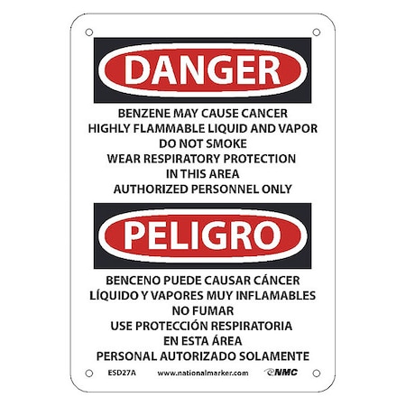 OSHA Sign ESD27. Legend: Danger Peligro Benzene May Cause Cancer Highly Flammable Liquid and Vapor Do Not Smoke Wear Respiratory Protection In This Area Authorized Personnel Only (bilingual)