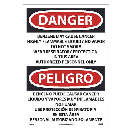 OSHA Sign ESD27. Legend: Danger Peligro Benzene May Cause Cancer Highly Flammable Liquid and Vapor Do Not Smoke Wear Respiratory Protection In This Area Authorized Personnel Only (bilingual)