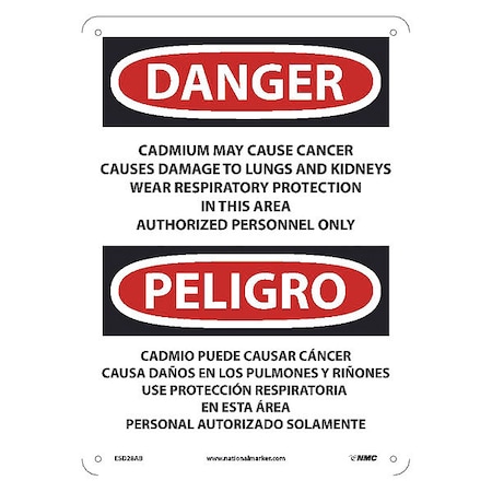 OSHA Sign ESD28. Legend: Danger Peligro Cadmium May Cause Cancer Causes Damage To Lungs and Kidneys Wear Respiratory Protection In This Area Authorized Personnel Only (bilingual)