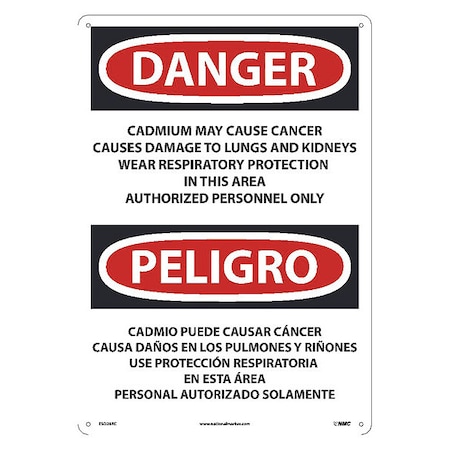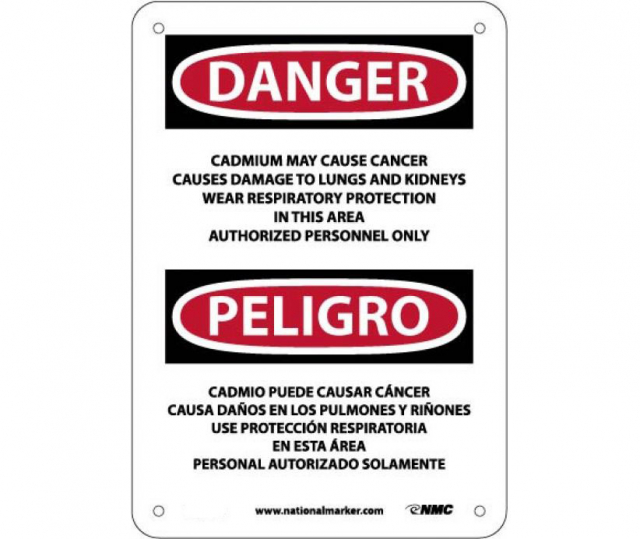 OSHA Sign ESD28. Legend: Danger Peligro Cadmium May Cause Cancer Causes Damage To Lungs and Kidneys Wear Respiratory Protection In This Area Authorized Personnel Only (bilingual)
